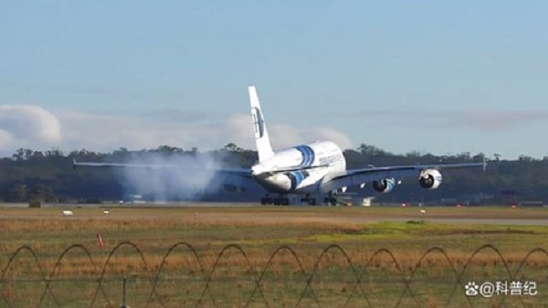 這是A380落地時,輪胎接觸地面的畫面。伴隨著摩擦冒出的白色煙霧,經過多次反彈后,終于穩穩地降落在了地面上。