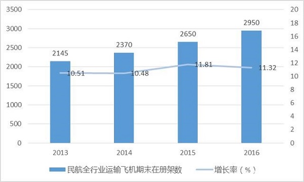(2013-2016年中國民航全行業運輸飛機在冊架數增長情況)