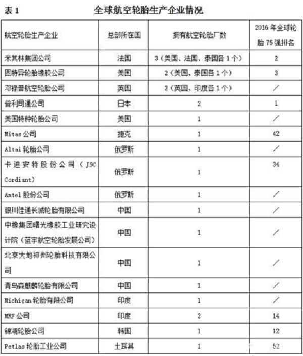下表是2017年的全球輪胎企業生產情況,中國企業雖有生產,但是排名較低,國外寡頭把持,對于每年需求在60萬條的中國航空事業來說,是一個很大的支出。