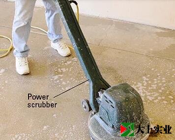 用水弄濕整個地板,使用濕磨機打磨整個地板。使用硬毛刷擦洗機器無法觸及的角落和墻壁。