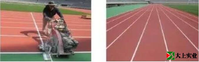 按照國際田聯(lián)IAAF《田徑場地設(shè)施標(biāo)準(zhǔn)手冊》2008版標(biāo)準(zhǔn)進(jìn)行劃線,采用全站儀進(jìn)行放線操作,盡量使用白灰線盒,避免使用黑色線盒。由專業(yè)劃線師完成大面積的劃線。接頭以及數(shù)字部分由助手使用數(shù)字模具噴涂而成。使用的面漆盡量要求是聚氨酯耐黃變面漆,該材料具有較好的伸長率,與下面的顆粒粘接良好,不容易脫落與黃變褪色。