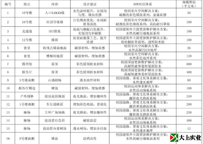 1、校園室內(nèi)空間解決方案主要是我們的耐擦洗彩色墻面系列,它有金屬質(zhì)感、高抗清漆的特點,主要應(yīng)用于3號樓南側(cè)涂鴉墻、社團導(dǎo)視墻、10號樓入口LOGO墻。