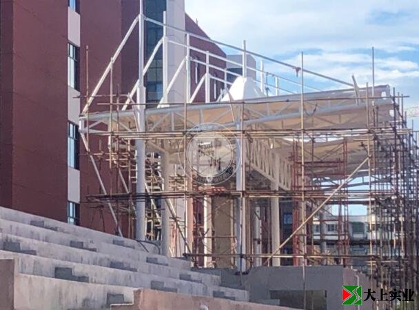 目前運動場看臺主體框架已經建成,膜結構頂蓋已經就位有工人正在鋼架上作業,看臺兩側的水泥階梯已經初具雛形,可以看出整個看臺的大致效果。