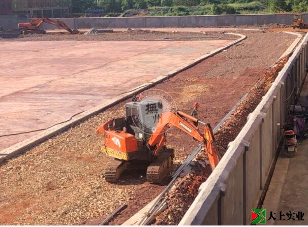 ,目前跑道輪廓清晰可見,已經鋪上了石子正在做路面硬化,有挖掘機正在路面上作業配合周邊管道填埋。