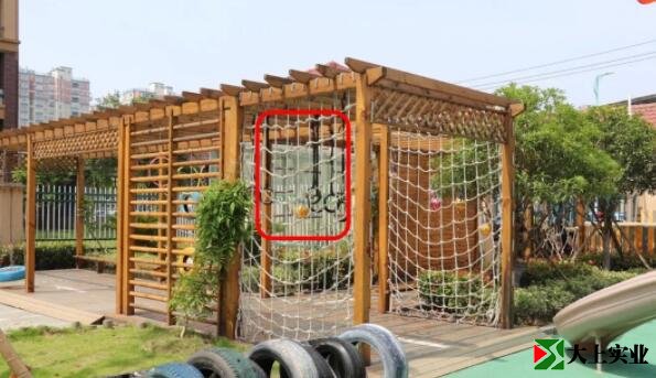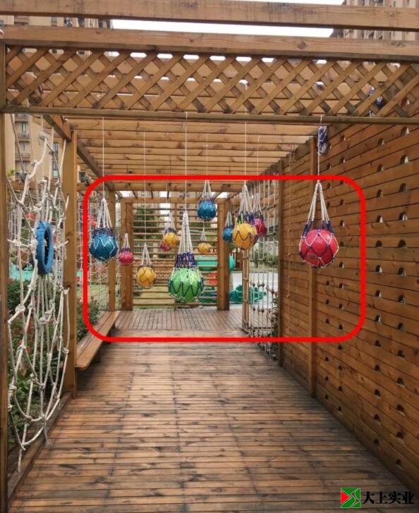 攀爬架:結(jié)合懸垂和跳高,利用幼兒園的富余材料,添置一些材料,在攀爬架處添加懸垂鐵環(huán)、皮球、鳥窩等,豐富幼兒在本區(qū)域中的運(yùn)動形式。