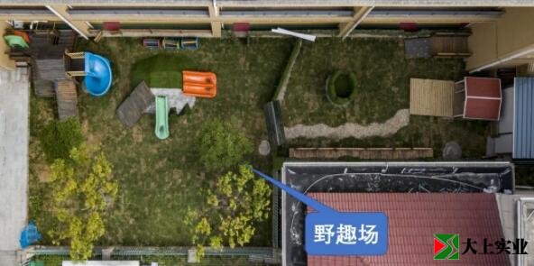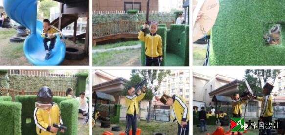 野趣場:教學(xué)樓后院原先是長不出菜的菜園,因?yàn)楸酬帥]有陽光。于是,我們在此建小城堡,添軍隊(duì)服飾道具,以引發(fā)孩子野戰(zhàn)游戲。